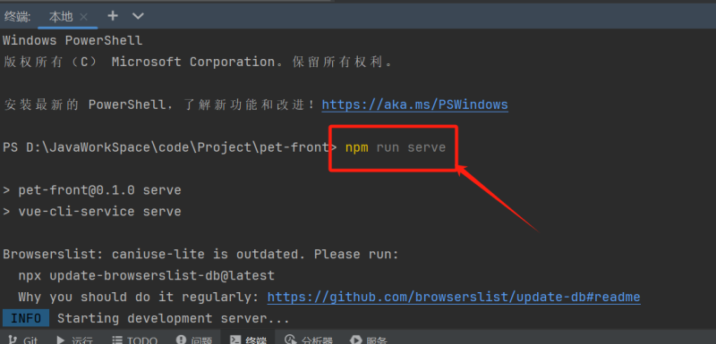 当依赖下载完成之后,在终端输入npm run serve启动前端项目
