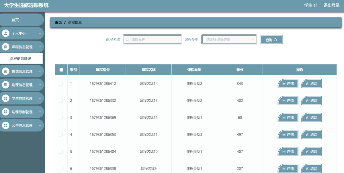 2.课程信息管理:学生可以查看选修课程的相关信息,包括课程名称、授课教师、上课时间地点等。
