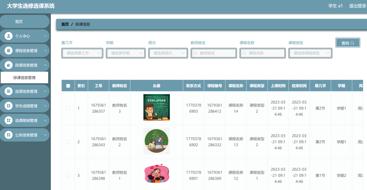 3.排课信息管理:学生可以查看选修课程的排课信息,包括上课时间,上课地点、授课教师等。