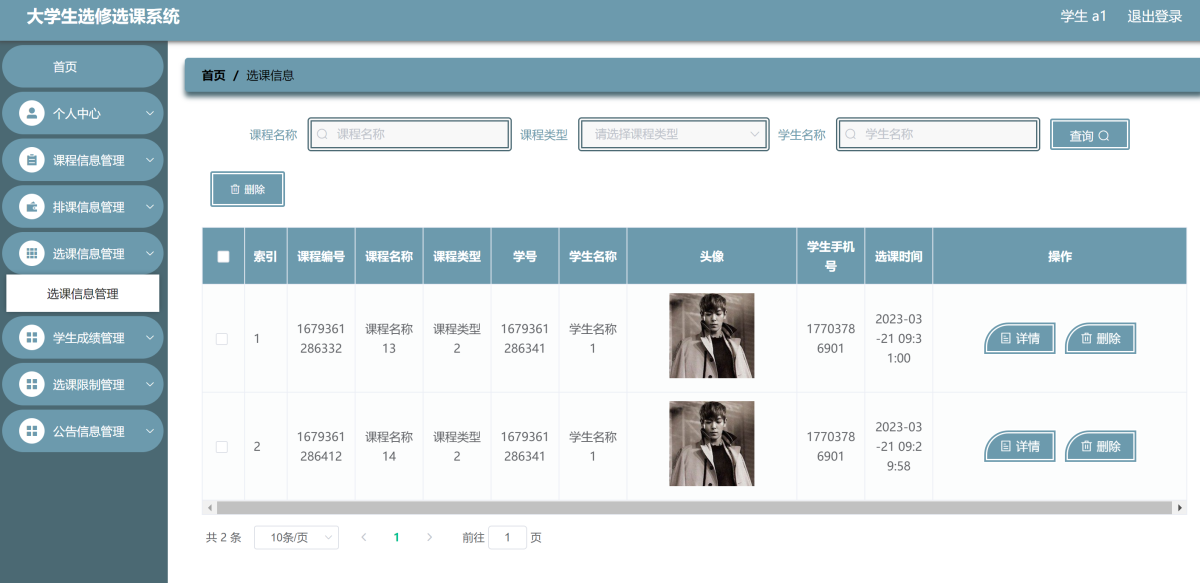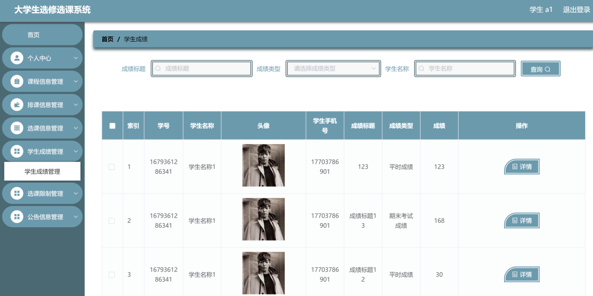 1.个人中心:学生可以在个人中心查看个人信息,包括选修课程、学生成绩等。