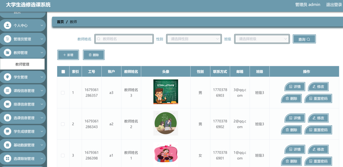 3.教师管理:管理员可以管理教师信息,包括添加、编辑、删除等操作。