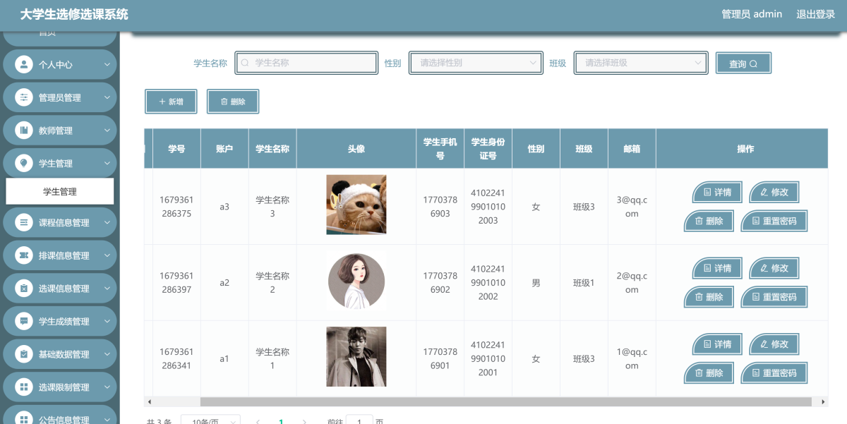 2.学生管理:教师可以管理所教授课程的学生信息,包括添加、编辑、删除等操作。