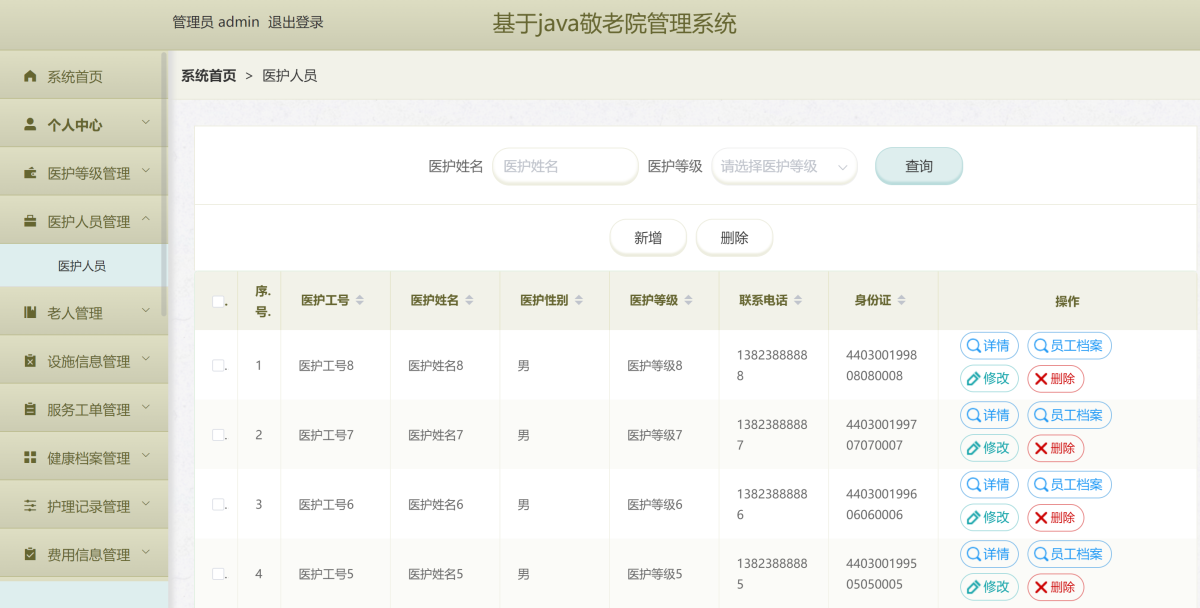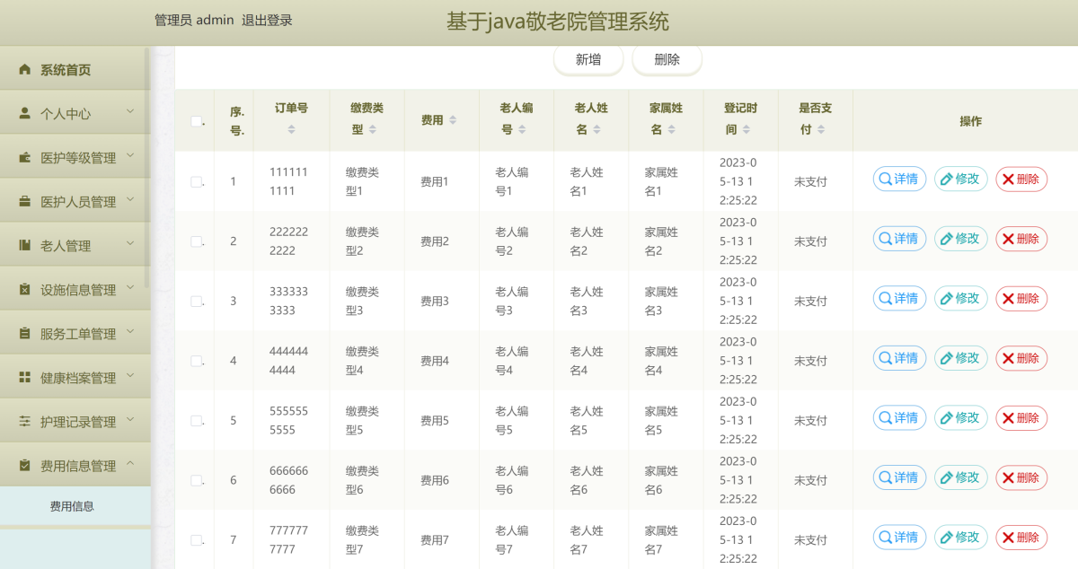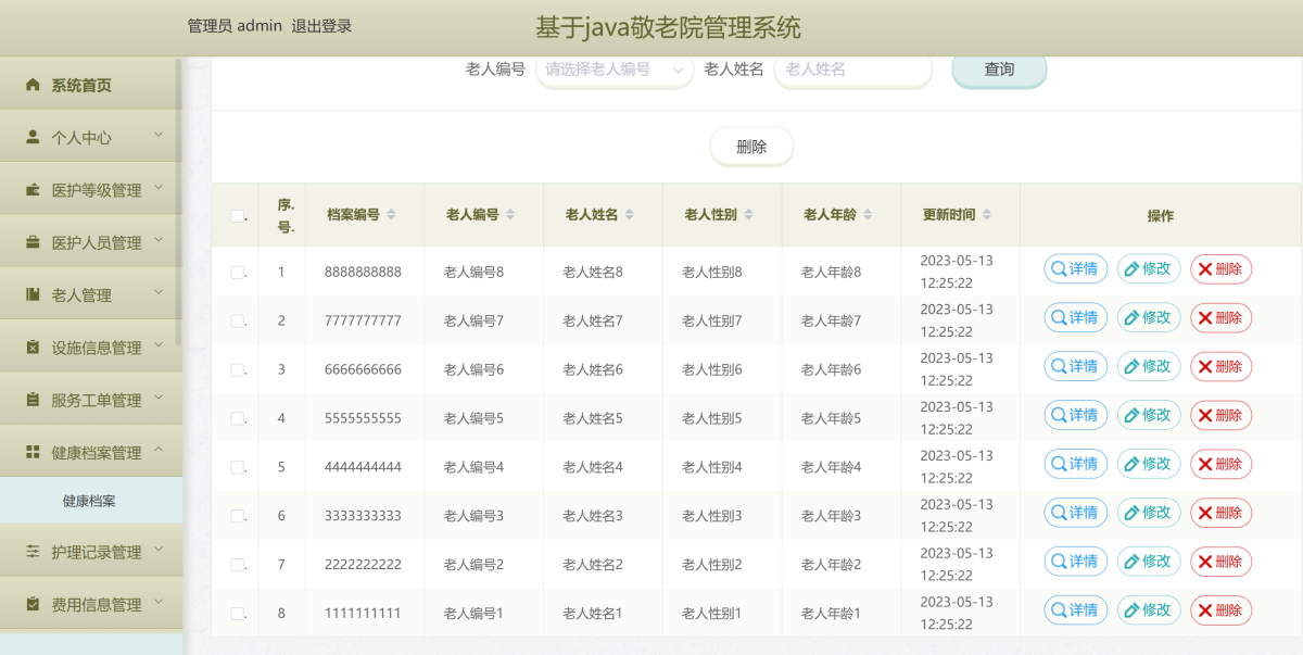 4. 老人管理:管理员可以管理老人的信息,包括添加、编辑、删除等操作。