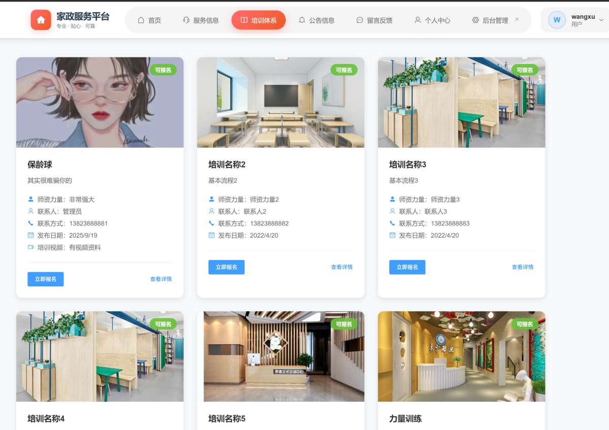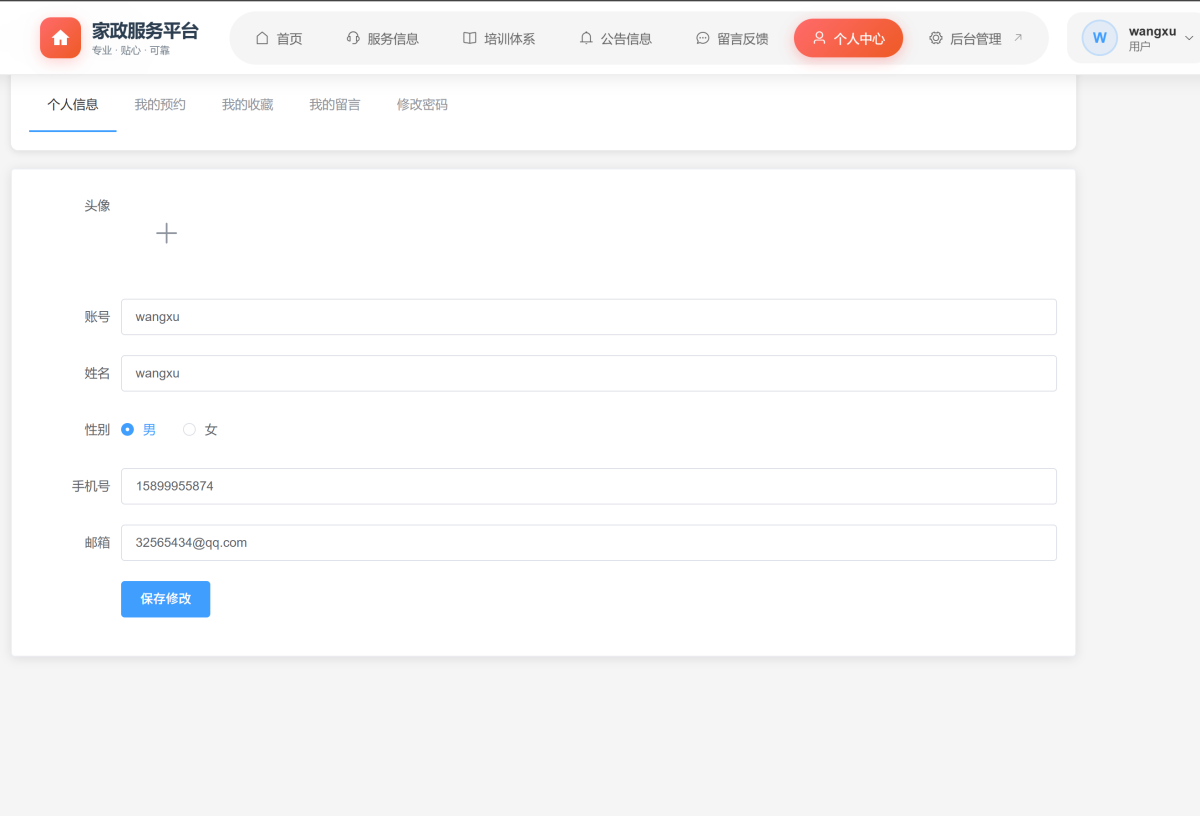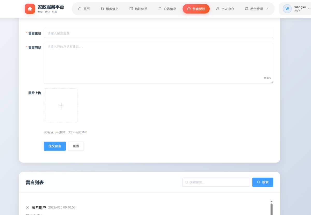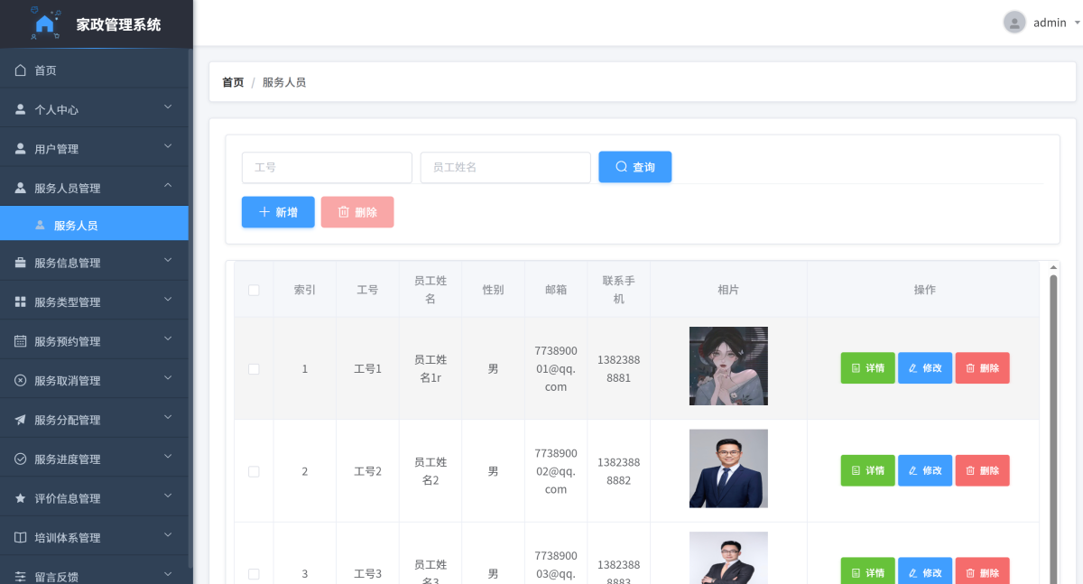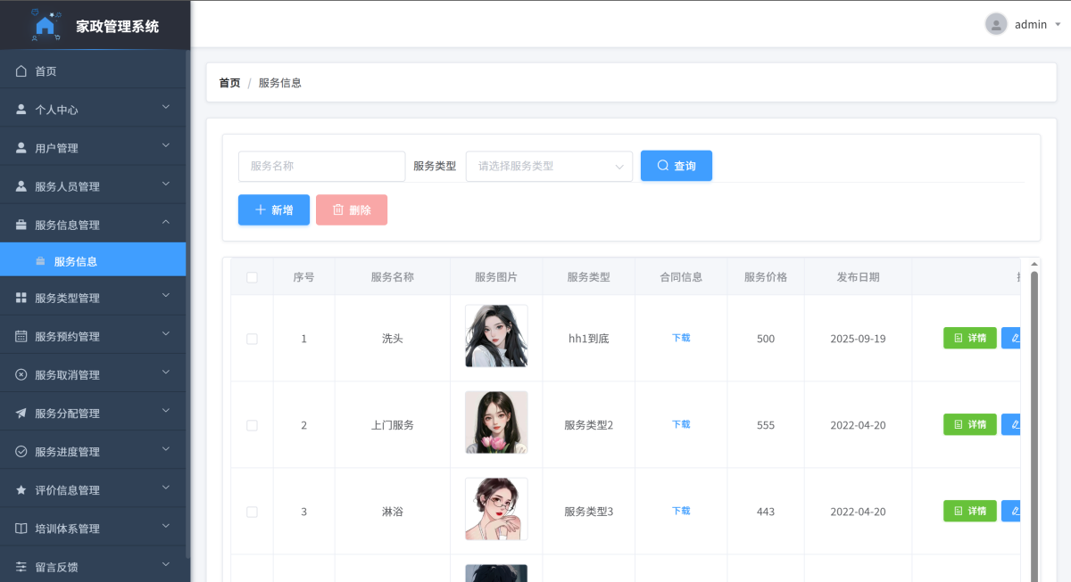 4. 家政服务管理:对家政服务信息进行添加,修改,删除,查询,查看留言,审核上下架