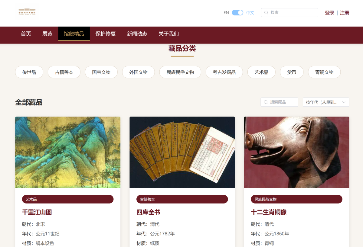 3. 用户查看文物分类,文物详情信息,收藏文物,留言咨询服务