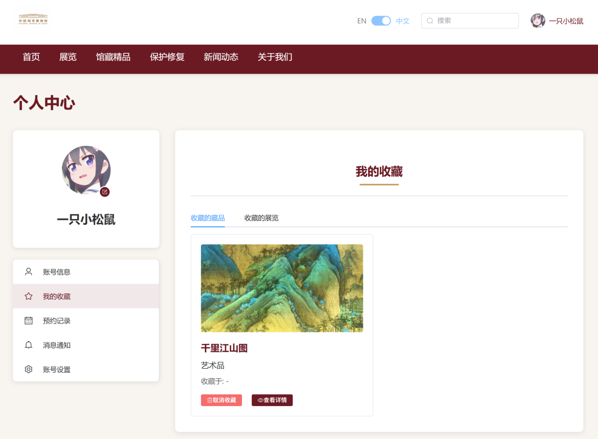 8. 用户个人中心查看收藏的文物和展览信息