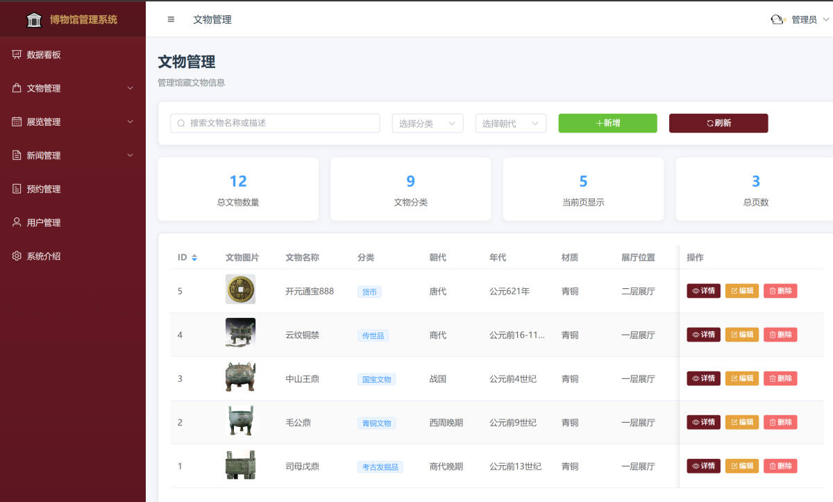 4. 文物管理:对文物信息进行添加,修改,删除,查询,查看留言,审核上下架